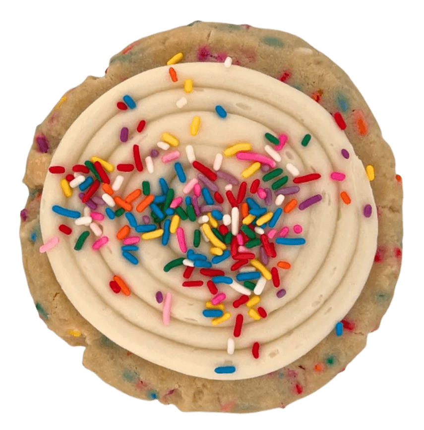 Sugar cake cookie with white chocolate chips and sprinkles, topped with swirled buttercream and rainbow sprinkles.