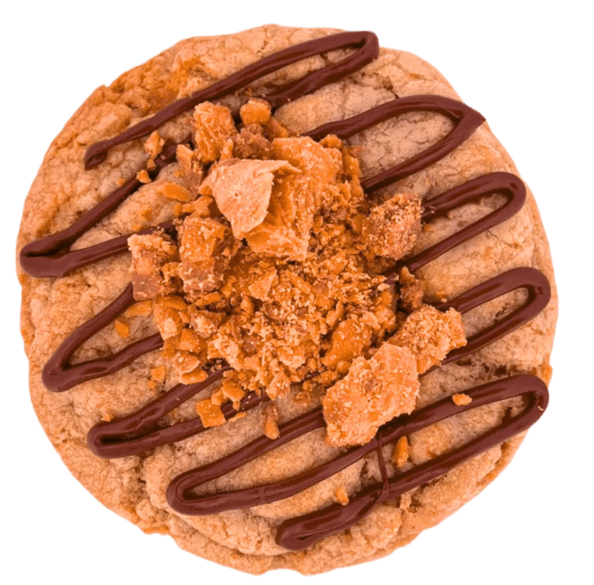 A buttery cookie packed with crushed Butterfinger pieces and peanut butter chips, finished with a rich chocolate drizzle and more crushed Butterfinger on top.