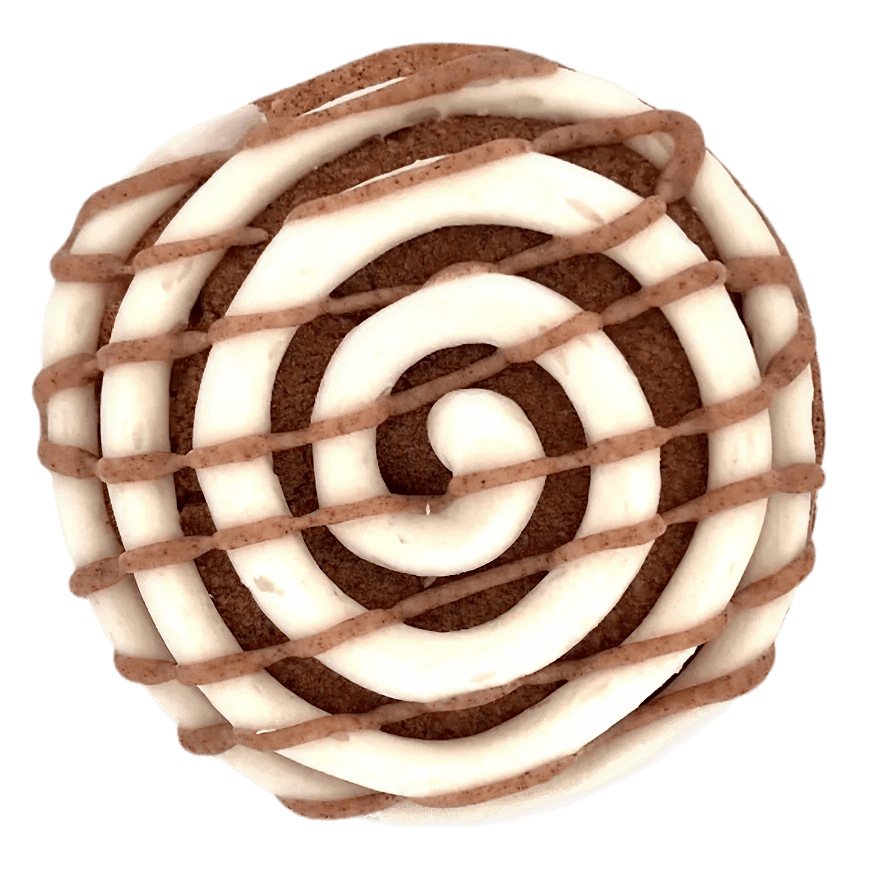 Warm snickerdoodle cookie with brown-sugar butter topping, cream cheese frosting swirl, and cinnamon-sugar drizzle.