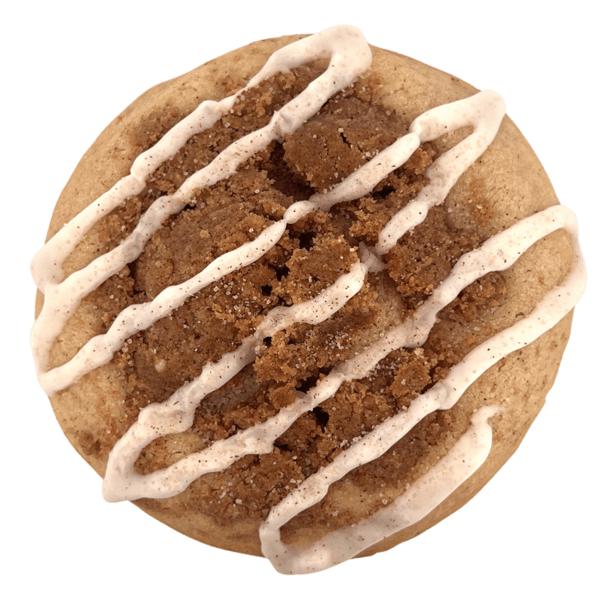 A soft vanilla cookie filled with rich brown sugar cinnamon, topped with buttery crumb streusel and finished with vanilla glaze.