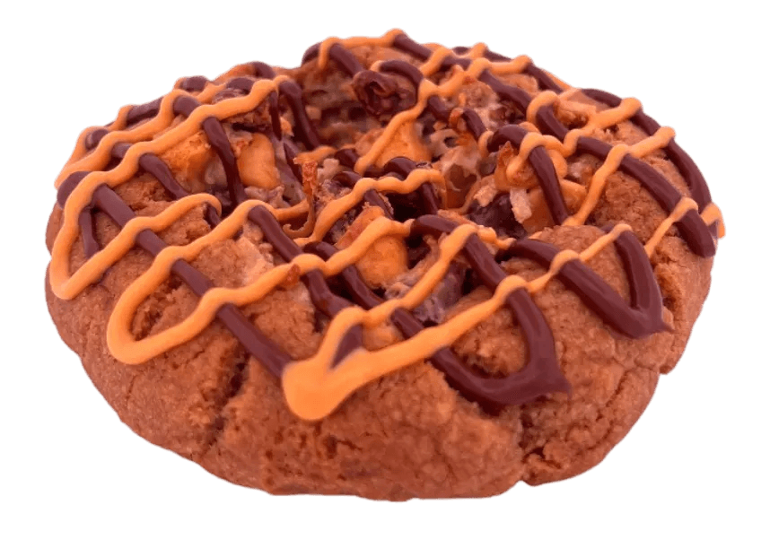 A graham cracker cookie loaded with semi-sweet chocolate chips, butterscotch chips, coconut, and pecans, finished with sweetened condensed milk and drizzled with melted chocolate and butterscotch.