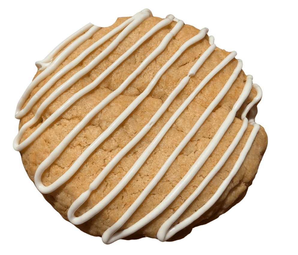 A soft orange sugar cookie with a creamy center, finished with a sweet white chocolate drizzle.