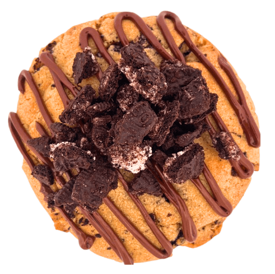 A soft peanut butter cookie loaded with Oreo pieces and peanut butter chips, topped with a chocolate drizzle and crushed Oreos.