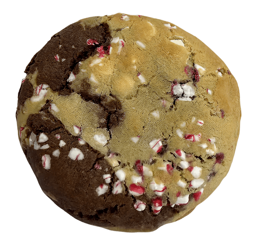 A chocolate–peppermint brownie cookie swirled with a buttery white chocolate chip peppermint cookie and topped with crushed peppermint.