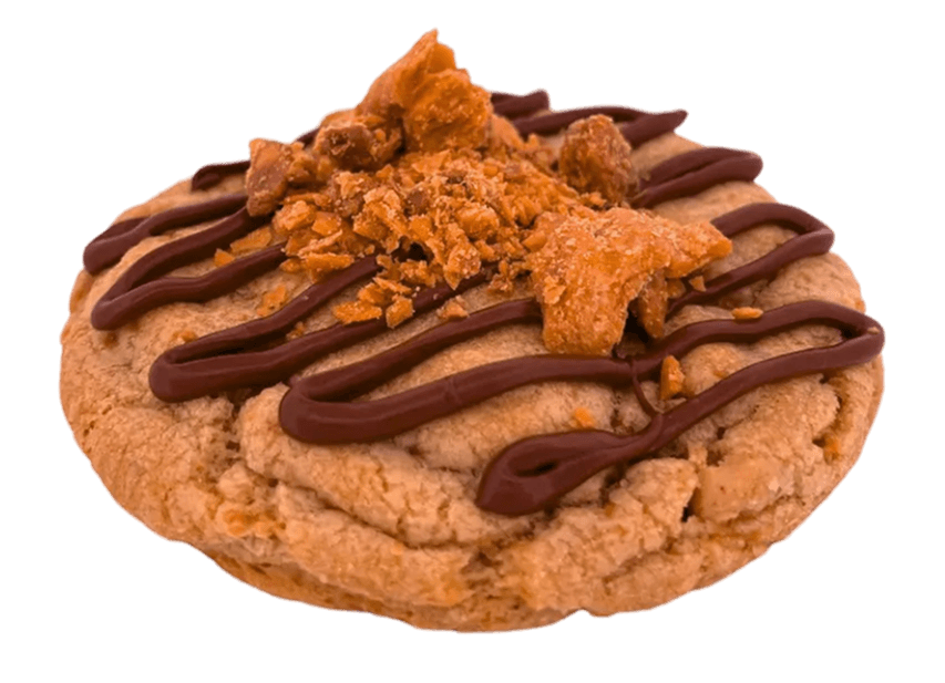 Four buttery cookies packed with crushed Butterfinger pieces and peanut butter chips, finished with a rich chocolate drizzle and extra Butterfinger crumbles on top.