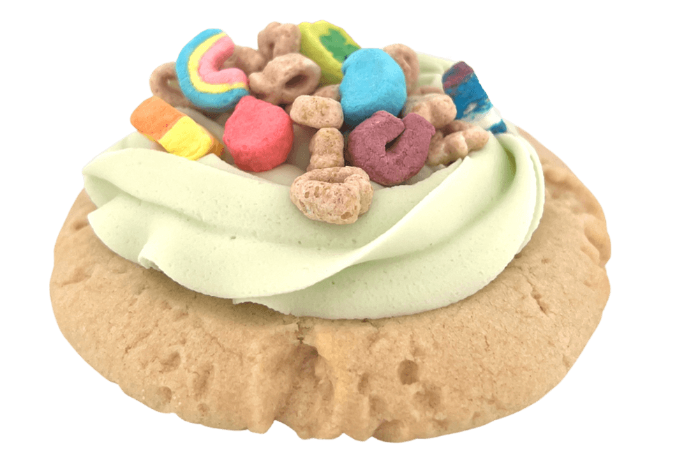 4 soft sugar cookies topped with smooth green frosting and Lucky Charms cereal for a colorful, nostalgic crunch in every bite.