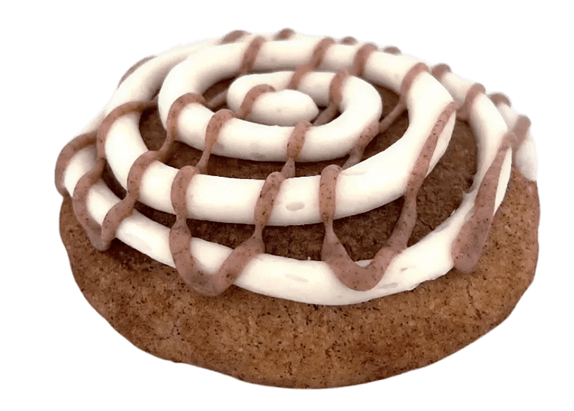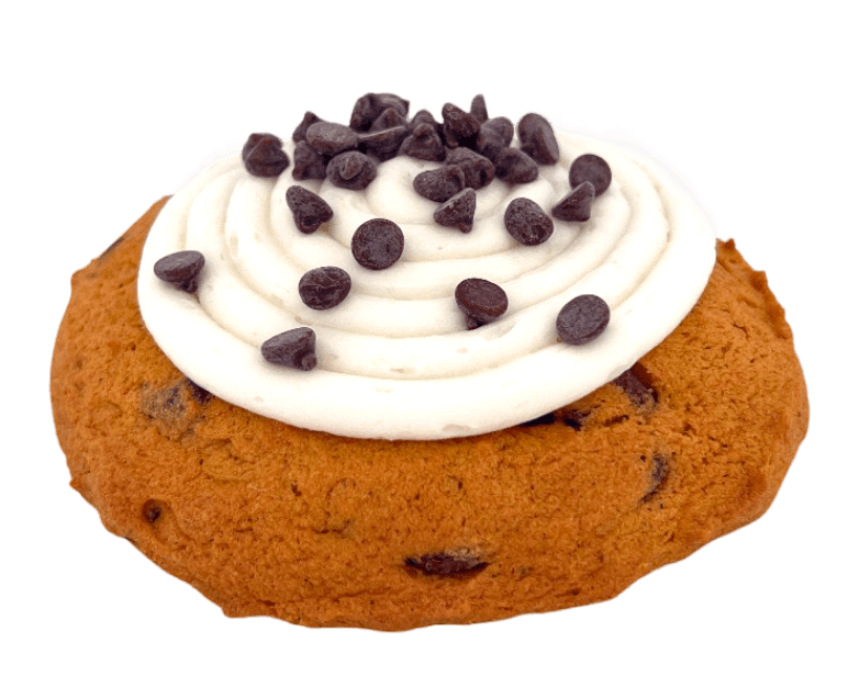 Four soft pumpkin cookies made with warm fall spices and loaded with chocolate chips. Each cookie is topped with a smooth cream cheese frosting and finished with mini chocolate chips for balance and texture.