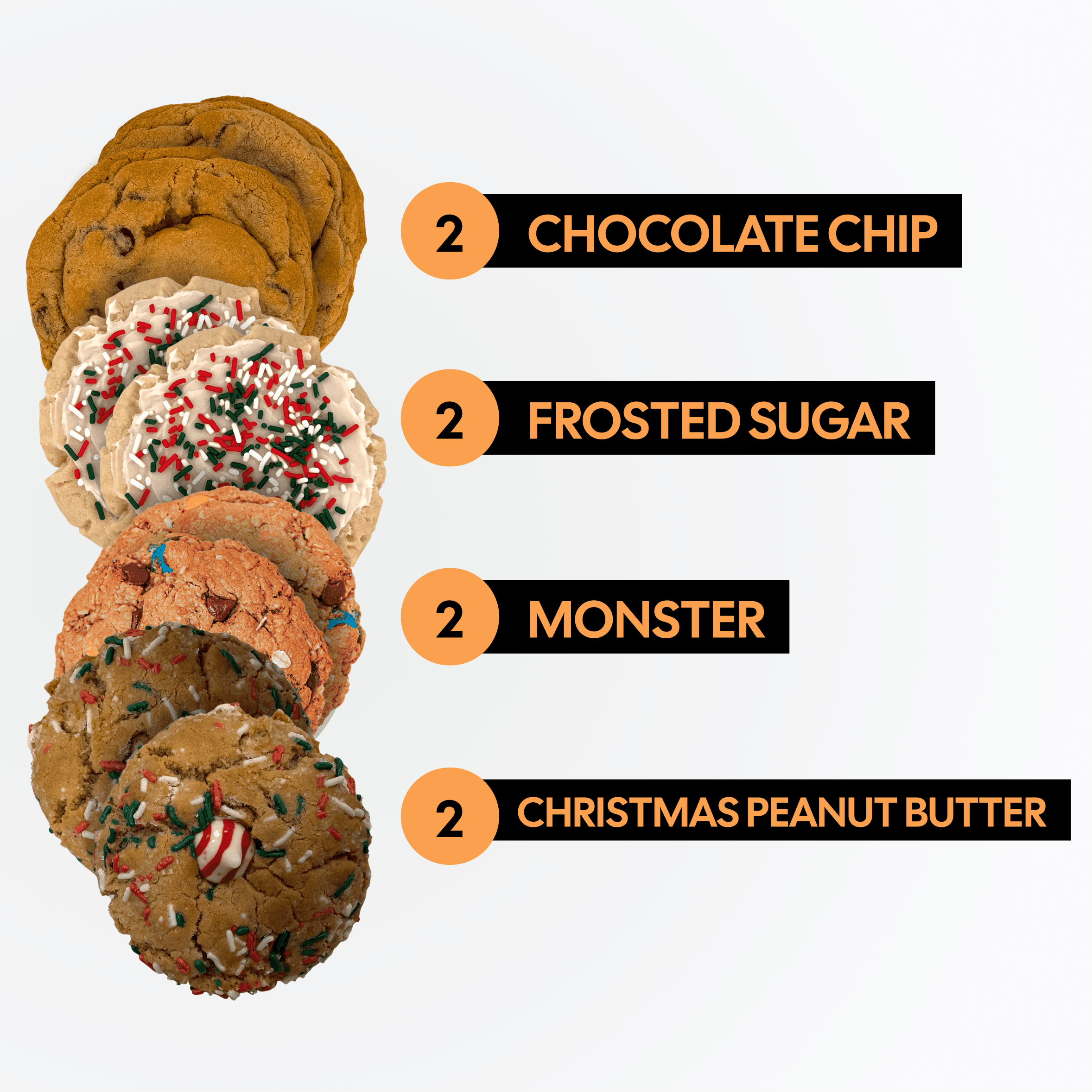 Double up on the favorites. This box includes 2 Chocolate Chip, 2 Monster, 2 Christmas Peanut Butter, and 2 Frosted Sugar cookies. Balanced, crowd-pleasing, and perfect for sharing.